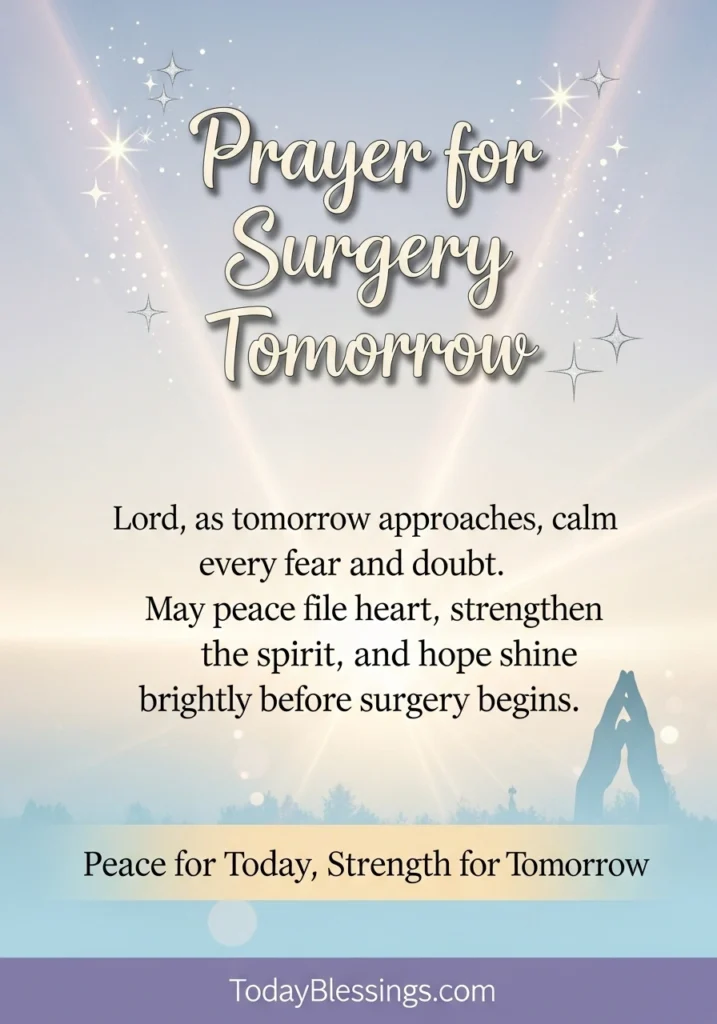 Father, calm me before surgery. May Your presence surround me, Your wisdom guide the doctors, and Your love bring healing and peace.