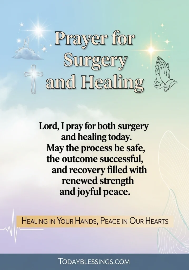Lord Jesus, guide the surgeons’ hands today. May every moment of this surgery be blessed with safety, skill, and peace, leading to healing and full recovery.