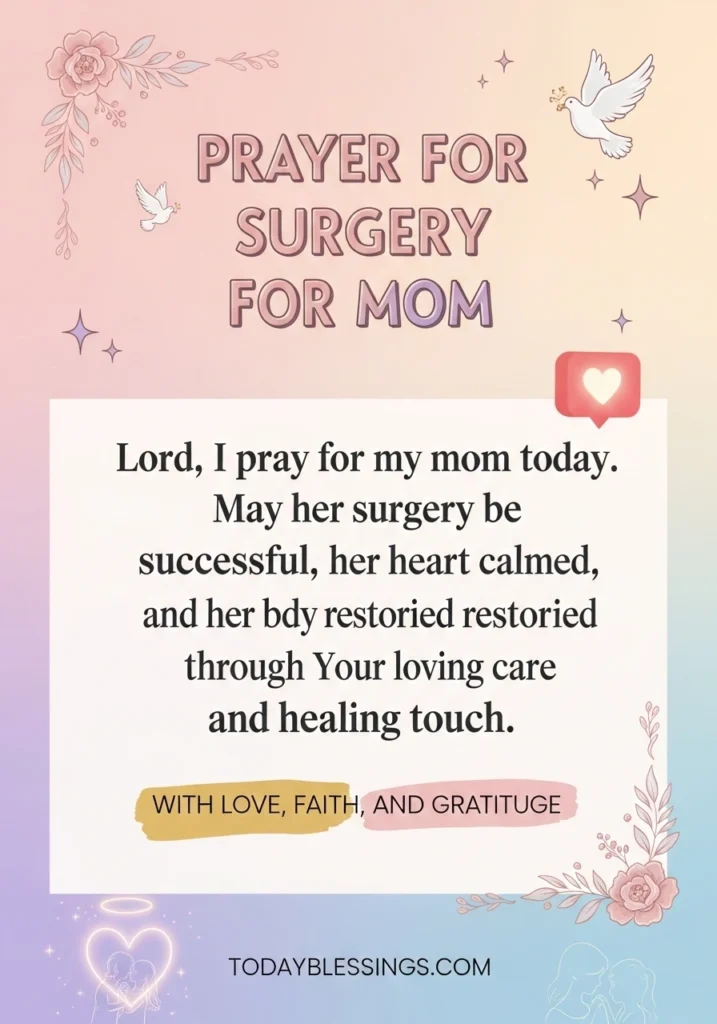 God, I ask You to watch over my mom today. May her surgery be safe, her heart peaceful, and her health restored for many more joyful days.