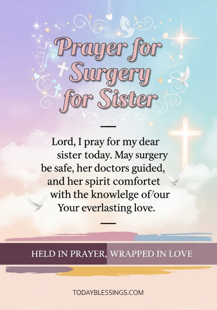 Heavenly Father, grant my sister strength and peace. Let her surgery be successful and her recovery gentle, filling her heart with gratitude and her body with health.
