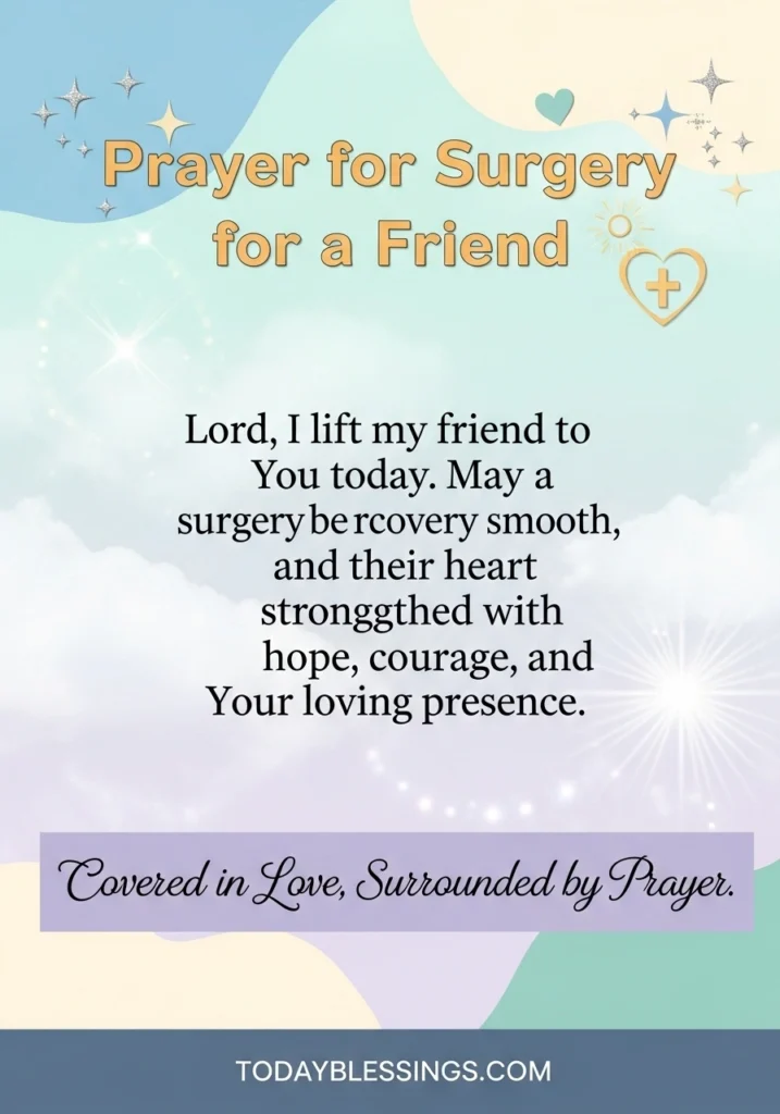 Lord, grant my friend courage and calm. May surgery restore health, recovery bring joy, and their life shine brighter with faith and gratitude.