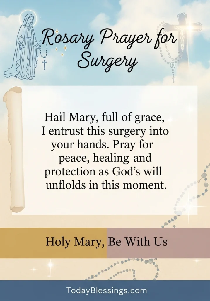 Heavenly Father, through the intercession of Mary, our Mother, I pray for protection and healing during this surgery, trusting in Your mercy and divine will.