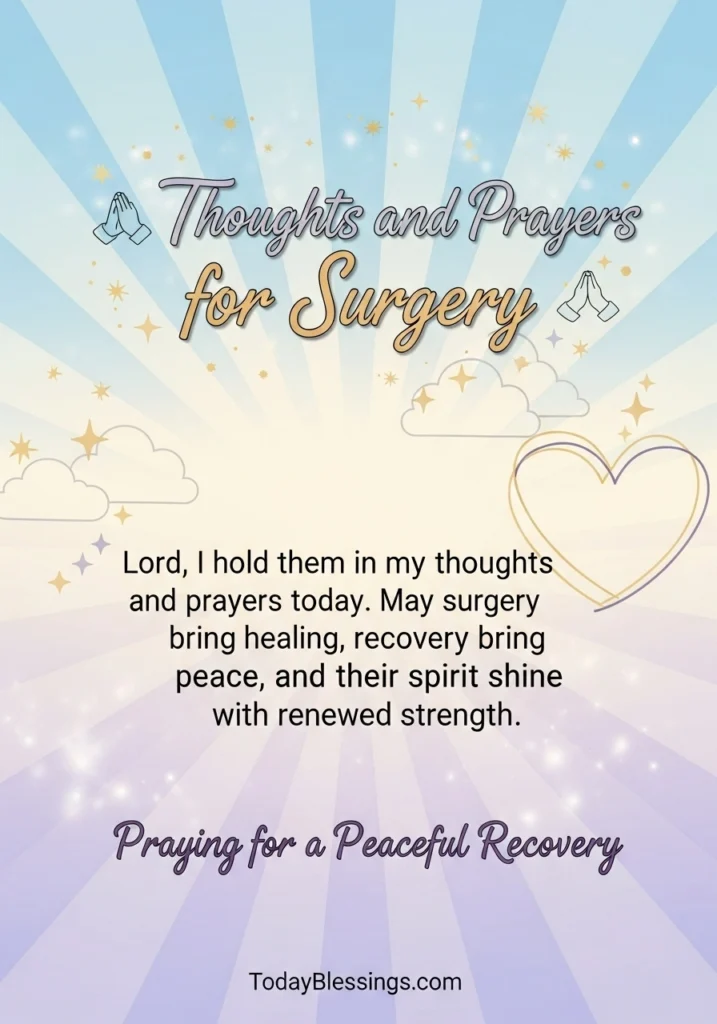Heavenly Father, I send thoughts of comfort and prayers of peace. May surgery be safe, recovery joyful, and life filled with gratitude.