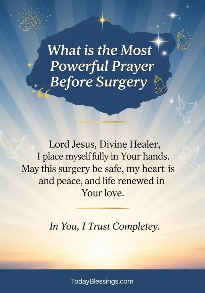 Lord Jesus, Divine Healer, I place myself fully in Your hands. May this surgery be safe, my heart at peace, and my life renewed in Your love.