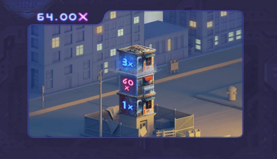 After the stake is locked, the game starts dropping buildings. Each one adds its multiplier to the round total. Suburb, City, Green, Elite, and Neon Houses all contribute based on their fixed bands. When the characters with umbrellas jump from the tower, the game stops, and the final X is applied to your base bet.